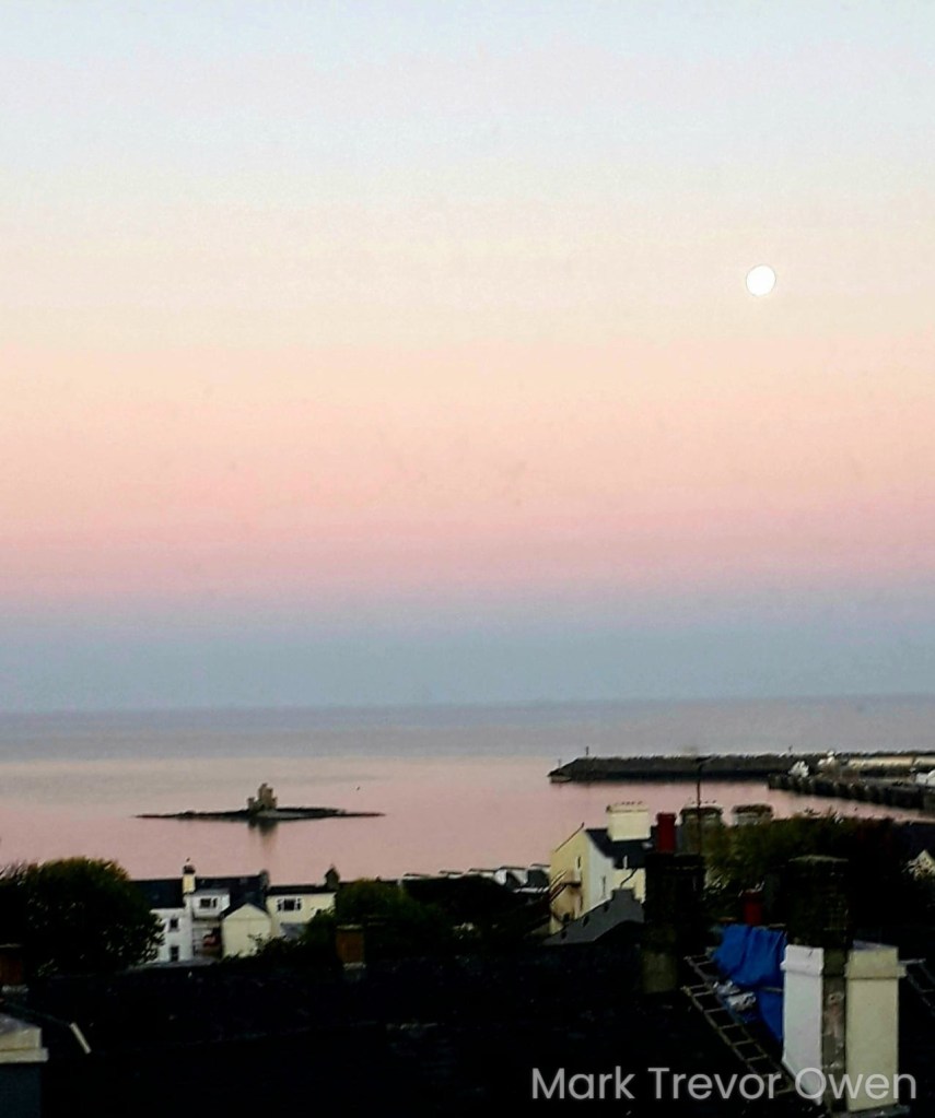 The pale full moon, gliding through the delicate pink and gold striations of the evening sky. The Tower of Refuge standing resolutely on Conister Rock. The limpid sea, clear as a mirror.